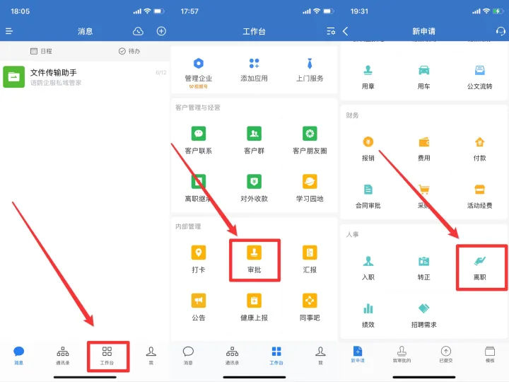 企業(yè)員工登錄手機(jī)端企業(yè)微信,在“工作臺(tái)”——“審批”——“離職”,填寫相關(guān)的離職信息后,就可以一鍵進(jìn)行提交了。