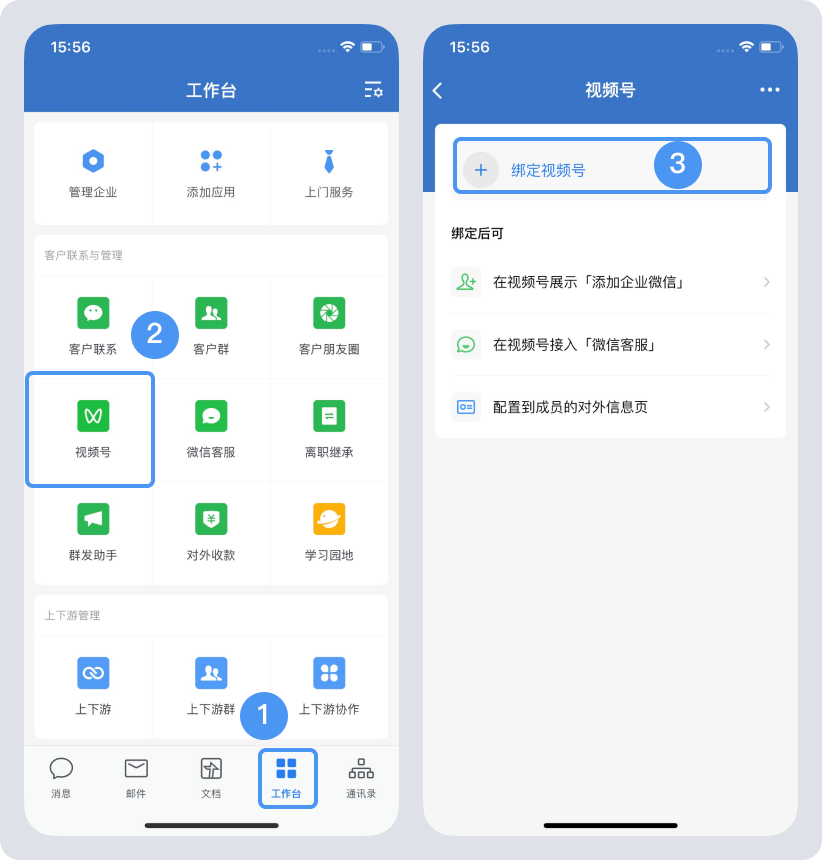 【手機端——工作臺-——視頻號——綁定視頻號】