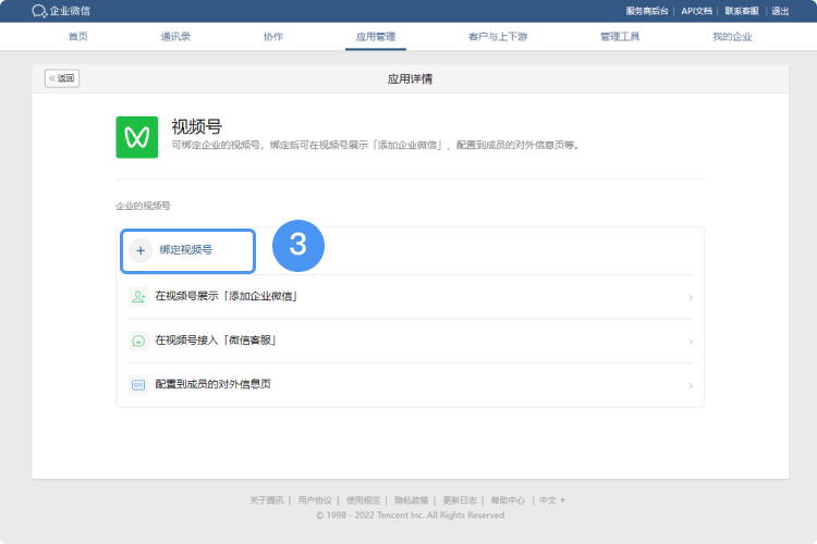(2)企業(yè)管理員也可以在企業(yè)微信管理后臺的【應用管理】-【視頻號】中進行綁定。具體操作如下圖:
