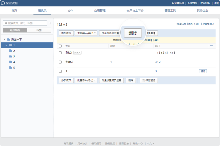 企業也可以選擇從通訊錄中主動把離職成員刪除掉,步驟為:企業微信管理員登錄企業微信,在“通訊錄”中找到該離職成員,直接勾選,刪除即可。