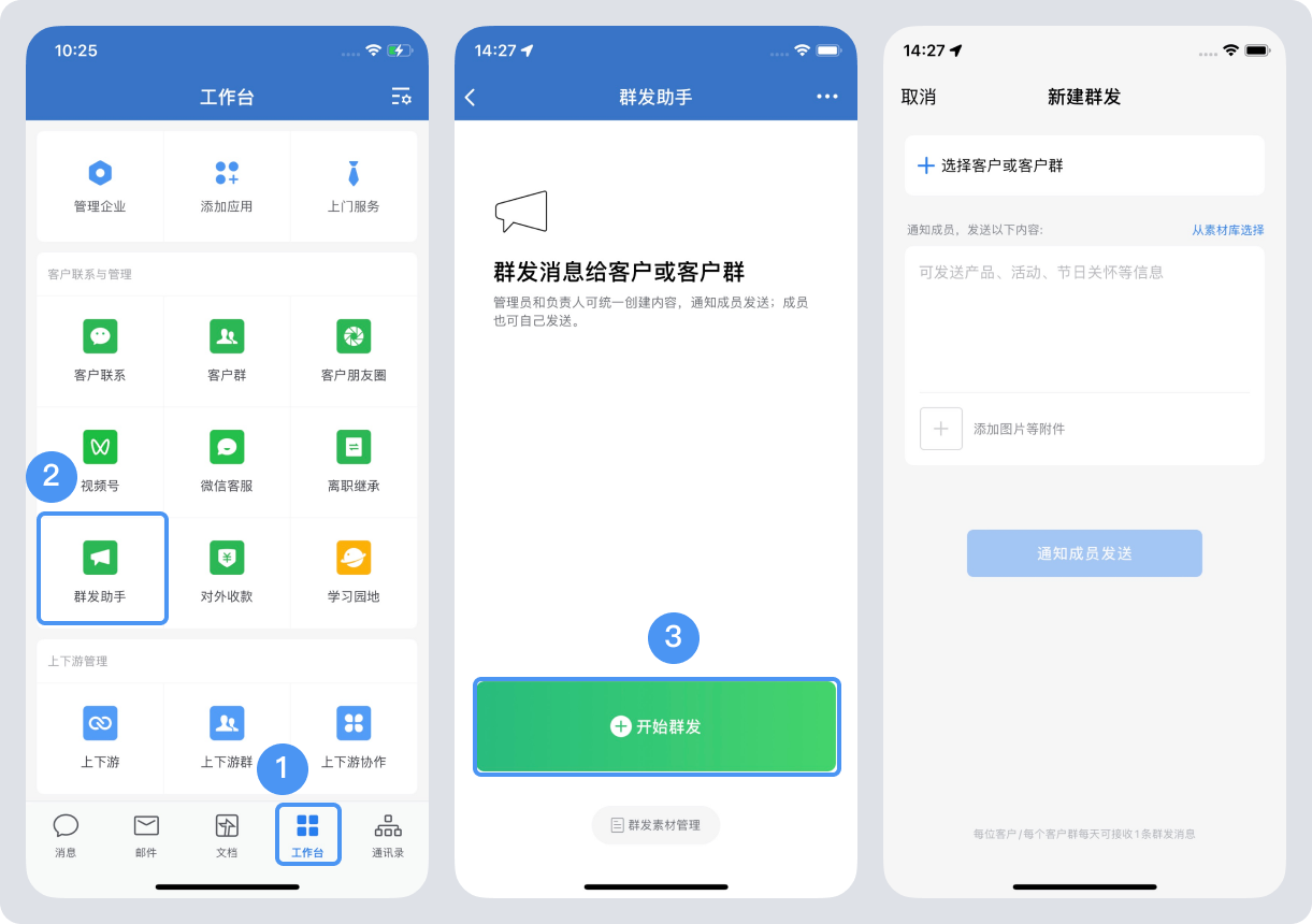 手機端:登錄手機端企業微信,在“工作臺”——“群發助手”——“開始群發”。