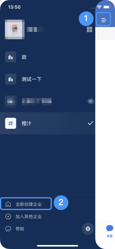 B.消息頁面->左上角三橫->右下角設置->管理企業->全新創建企業
