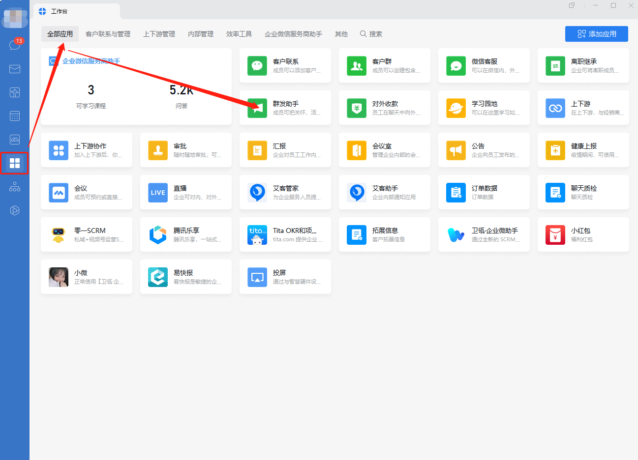 一、打開企業微信,點擊【工作臺】—【全部應用】—找到【群發助手】