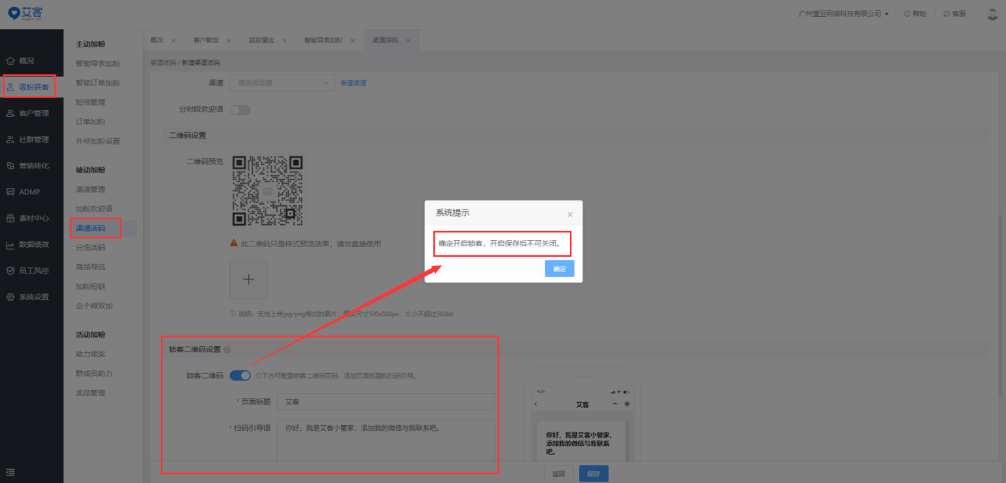 我們對企業微信進行廣告投放時,我們不知道具體有多少客戶是通過二維碼添加了我們的企業,也不知道引流效果如何。想要知道這些數據,小編推薦大家使用艾客SCRM系統的渠道活碼功能。