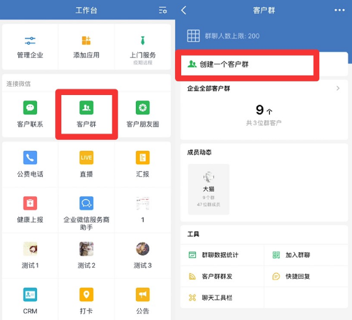企業外部群成員數量上限是500人,人數達到上限后,需重新創建新的群聊。而使用企業微信創建群聊的操作很簡單,企業成員可在企微手機端【工作臺】—【客戶群】中[創建一個客戶群],然后邀請客戶入群即可。
