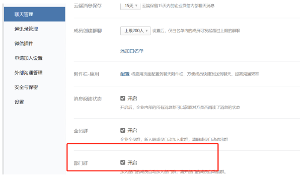 如果創建企業內部群的話,管理員需登錄企微后臺在【聊天管理】—【客戶群】中開啟。而企業內部群成員數量上限是2000人,部門人數達到3人就能自動創建部門群,在創建過程中系統會從部門上級中優先選擇一個做群主,如果沒有部門上級就會隨機挑選一人做群主。