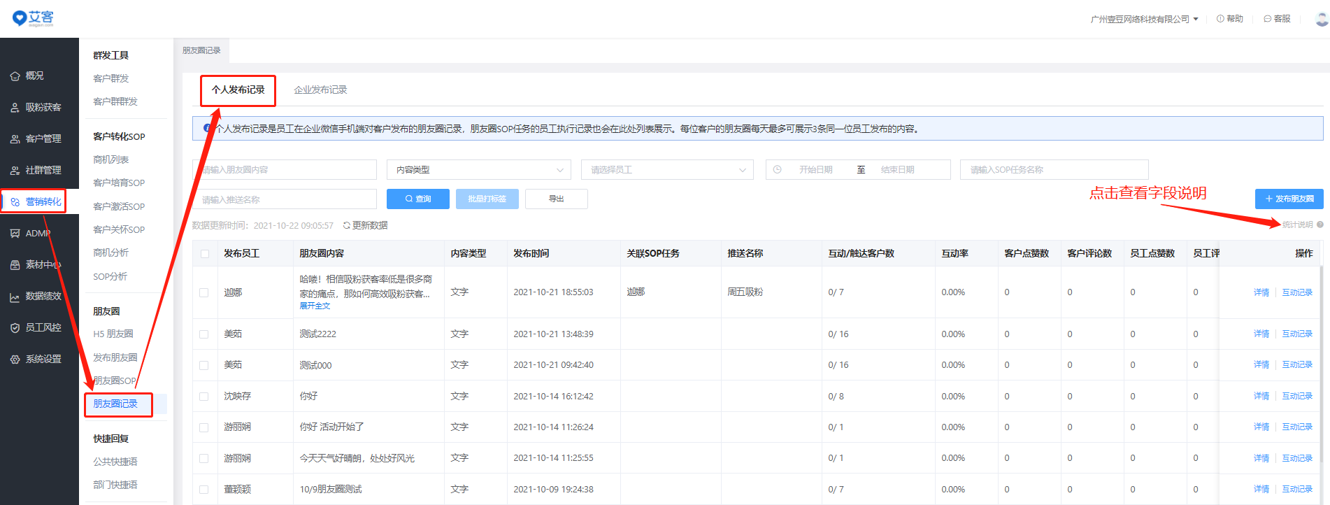 員工按照下發任務完成發布朋友圈后,系統將會通過發布內容,與任務內容進行相匹配,若發布內容一致的情況下可以統計到發圈的相關數據。