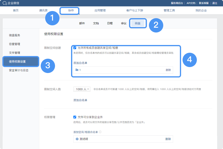 企業成員要創建微盤空間,需要有創建共享空間的權限,只有有了權限,才能看到創建空間的入口。企業微信管理員可以在企業微信管理后臺的“協作”——“微盤”——“使用權限設置”——“允許所有成員創建共享空間/相冊”。