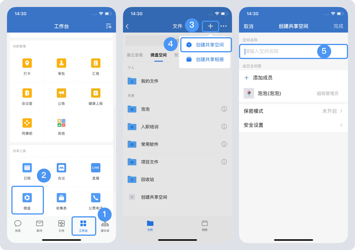 手機端:登錄手機端企業微信,在“工作臺”——“微盤”——“+”——“創建共享空間”——輸入空間名稱添加空間成員——“完成”即可。