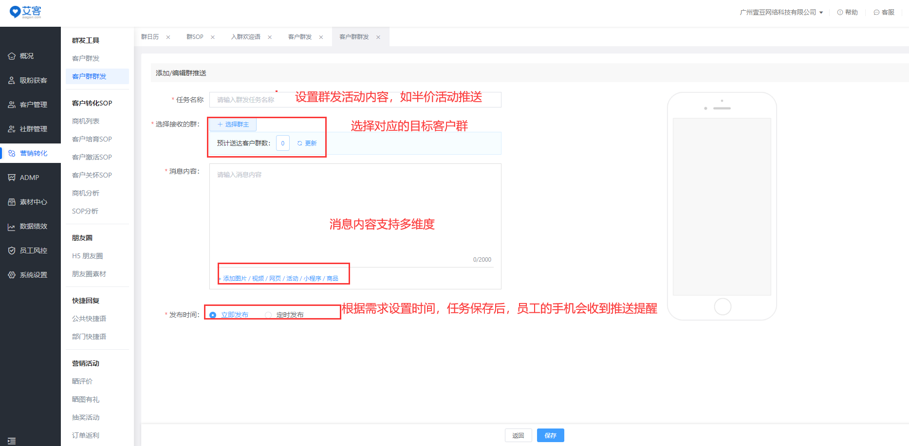 企業微信同樣也可以給客戶群群發。如果企業對客戶群群發具有更細致的要求,小艾推薦可以使用艾客scrm系統的客戶群群發功能,群主或員工可以根據制定的群給客戶群即刻或定時群發消息,可以實現快速的營銷觸達。