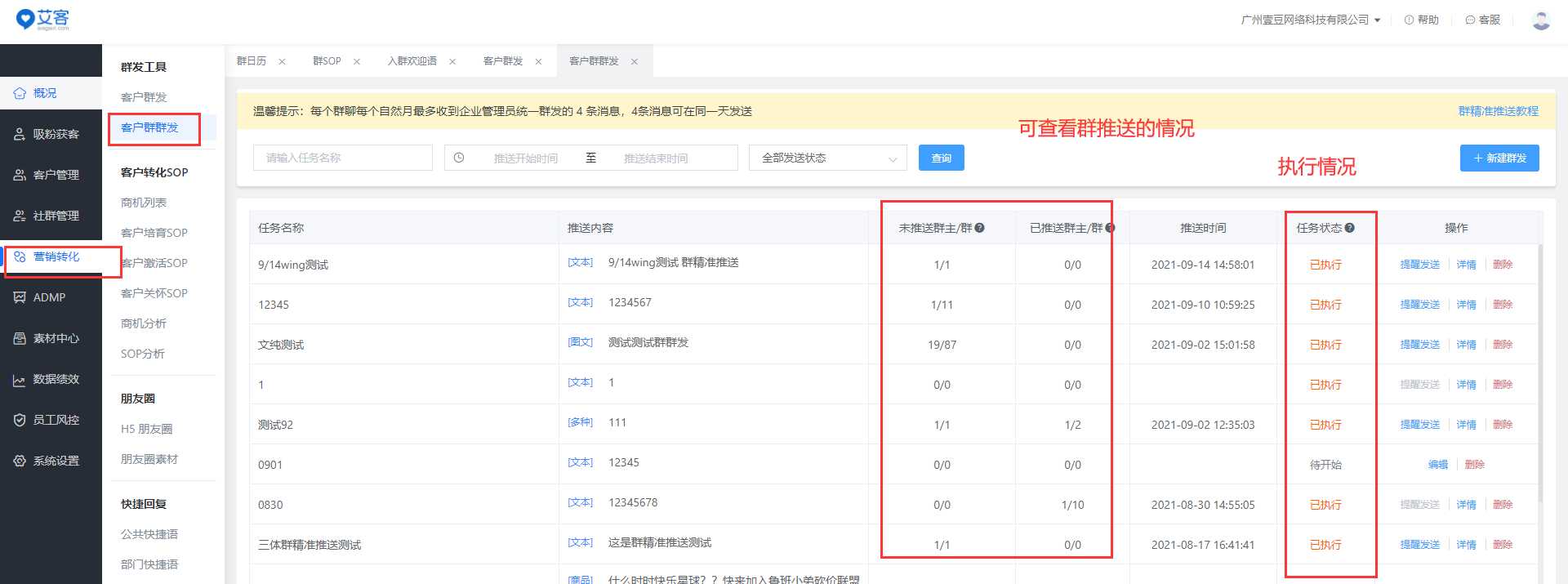 使用艾客的客戶群群發功能,企業精準推送任務搭建成功后,會先推送任務到對應群主員工的企業微信,需要員工同意后才可發出,也可以通過后臺查看到員工的執行情況,提高運營效率。另外需注意,每個客戶群每天只能接收1次群發消息,包含企業級與員工級群發方式,超過次數限制的客戶群消息將會被忽略。
