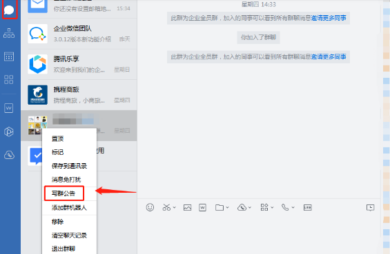 登錄PC版企微主頁(yè)后,點(diǎn)擊頁(yè)面左上方的“消息欄”,找到要發(fā)布群公告的群,然后在群頭像點(diǎn)擊鼠標(biāo)右鍵就可以“寫(xiě)群公告”。