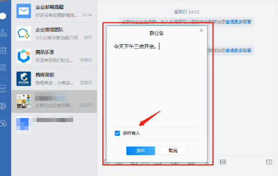 只需點(diǎn)擊“寫(xiě)群公告”,就可以在空白的位置編輯通知內(nèi)容,最后點(diǎn)擊發(fā)布即可。如果想提醒所有成員,勾選下方的“@所有人”即可。