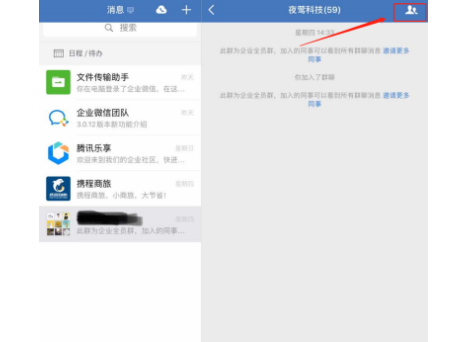 登錄企微手機(jī)客戶端后,在頁(yè)面“消息欄”中找到需要發(fā)布公告的企業(yè)群,然后點(diǎn)擊右上角的圖標(biāo)(如圖所示)。