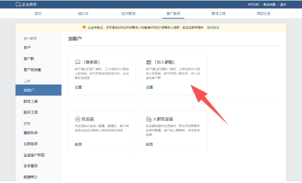 企業(yè)微信自帶群活碼功能,管理員進(jìn)入企微管理后臺,根據(jù)操作路徑【客戶聯(lián)系】—【加客戶】—【加入群聊】—【設(shè)置】,就能選擇自帶拉群方式,創(chuàng)建入群的企微二維碼,客戶掃碼就可以進(jìn)入群聊。