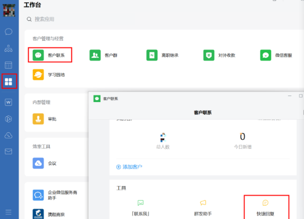 如果設置個人默認分組的話術,可由員工在移動端添加,在【工作臺】—【客戶聯系】中,找到快捷回復即可添加個人話術。