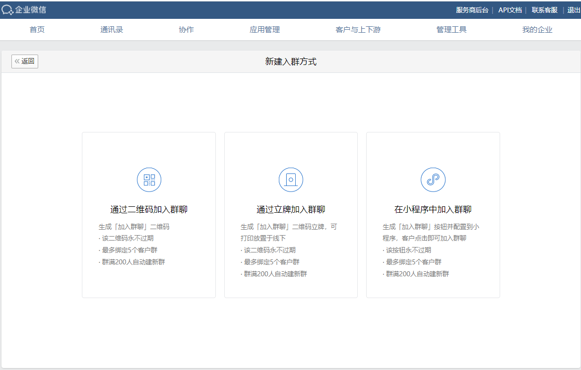 企業微信管理員登錄企業微信后臺,從“客戶聯系”——“工具”——“互動服務”——“加入群聊”,就可以選擇對應的入群方式了。