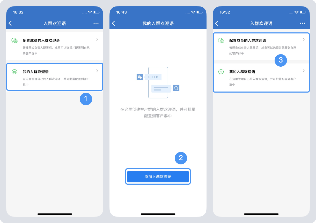 企業(yè)微信管理員以及項目負責人可以通過手機端企業(yè)微信來配置相關的入群歡迎語素材庫,設置完成后尅通知企業(yè)成員配置使用,設置步驟:“工作臺”——“客戶群”——“入群歡迎語”——“配置成員的入群歡迎語”,配置完成后,企業(yè)成員可以選擇并配置到自己的客戶群內(nèi)。