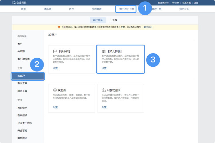 1、管理端:企業(yè)微信管理員登錄管理后臺(tái),在【客戶與上下游->客戶聯(lián)系->加客戶->加入群聊】開啟加入群聊即可。