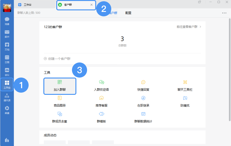 2、電腦端:企業(yè)成員和項(xiàng)目負(fù)責(zé)人登錄電腦端企業(yè)微信,在工作臺(tái)->客戶群->加入群聊】進(jìn)行設(shè)置。