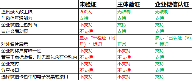 下圖就是企業微信認證和未認證能使用的功能,大家可以查看一下兩者有何區別。