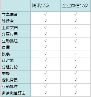 關于企業微信會議和騰訊會議功能區別,在這里小編簡單做了一個表格對比: