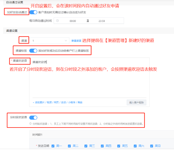 當使用渠道活碼后,企業在不同的渠道投放活碼,客戶掃碼添加時,系統自動給客戶打上標簽,并且也會發送對應的渠道歡迎語。當開啟了分時段歡迎語后,員工上下班不同時間段可以設置不同的歡迎語,而在分時段之外的時間段將發送渠道歡迎語。