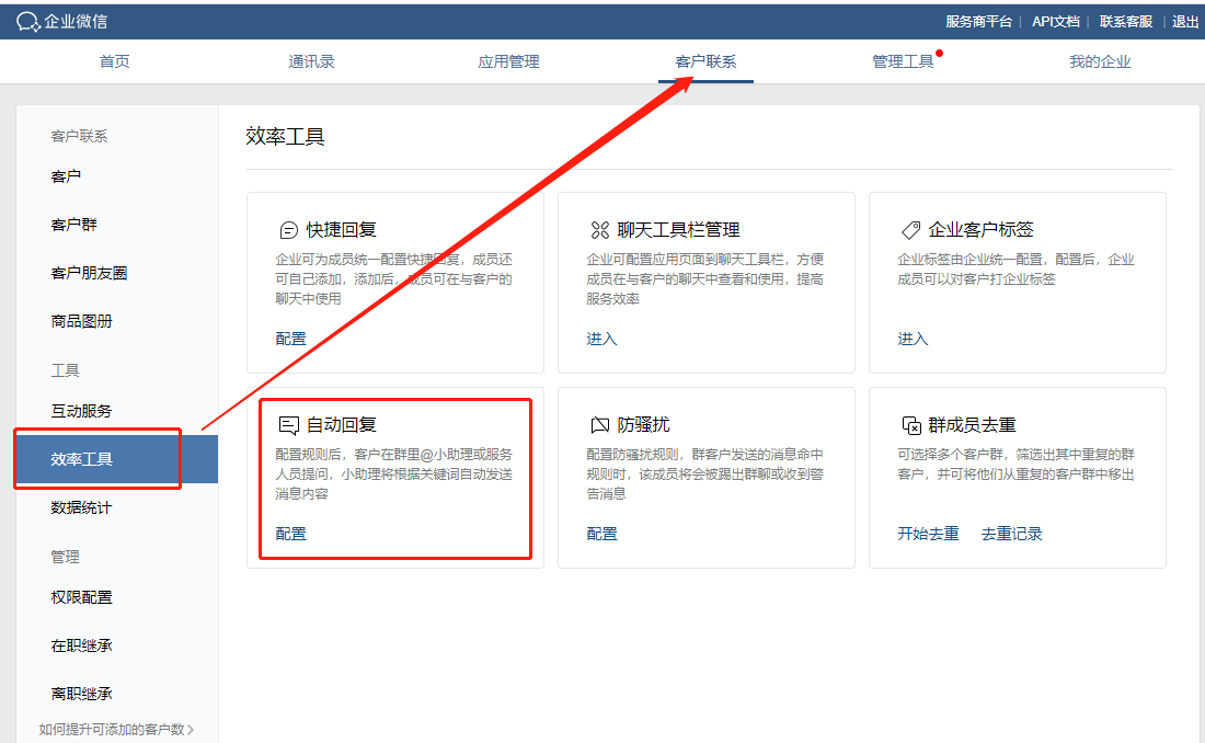 答案是支持的,企業微信目前是支持在群聊中設置關鍵詞自動回復的。登錄企業微信后臺,在”客戶與上下游”中找到“客戶聯系”再選擇“聊天工具”,聊天工具中就可以找到群自動回復功能,點擊配置就可以進行自動回復規則的創建了。