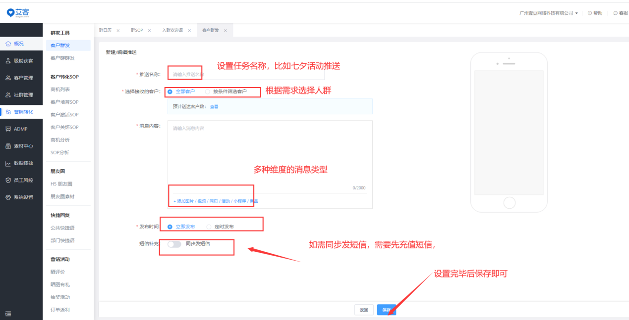 企業也可以選擇利用艾客SCRM系統里面的客戶群發功能,它可以根據員工和特定標簽給客戶即刻或定時群發消息,群發內容包含文字、圖片、網頁、活動、商品、小程序鏈接等消息類型,通過條件打標簽篩選出來的客戶,可以實現精準化快速的營銷觸達,系統支持查看發送目標客戶數、推送成功數量等。