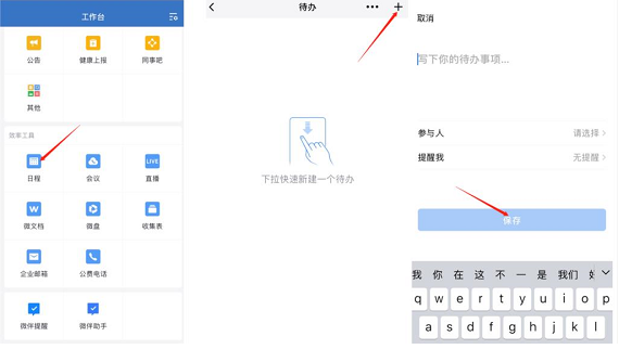 企業(yè)微信待辦事項提醒工具可提醒企業(yè)成員稍后處理某條消息,或?qū)α奶斐蓡T設(shè)置活動提醒。而企業(yè)微信代辦事項提醒功能設(shè)置起來也很簡單,只需要點進企業(yè)微信,找到【工作臺】—【日程】,然后點擊右上角的“+”號就可以創(chuàng)建代辦,創(chuàng)建完成后就可以在設(shè)定好的時間收到待辦事項的提醒。