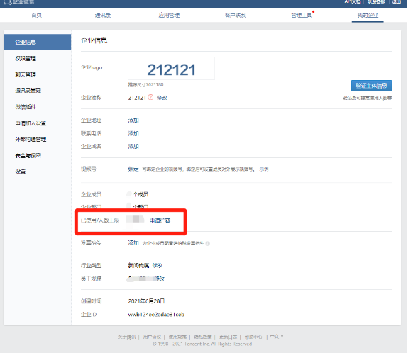 管理員登錄企業微信管理后臺后,在【我的企業】—【企業信息】—【已使用/人數上限】中就能看到申請擴容的字樣。