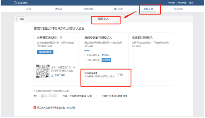 企業如果不想使用自動邀請功能,可在企業微信后臺的【管理工具】–【成員加入】頁面手動關閉,就不用擔心出現這個情況了。
