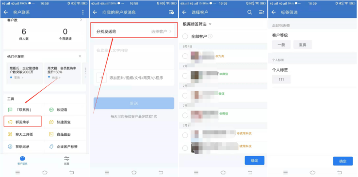 企業微信按標簽群發消費,只需要在工作臺中依次點擊【客戶聯系】—【群發助手】—【分別發送給】,再根據標簽篩選發給客戶即可。
