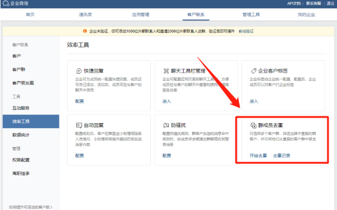 其實除了創建活碼,還可以使用企業微信本身就有的群成員去重功能。只需要管理員登錄到企業微信后臺,在【客戶聯系】—【效率工具】中找到群成員去重功能,管理員就可以選擇對哪些員工的群組進行群成員去重,如果檢測到重復加群了的客戶,管理員能勾選他們加入的群聊,提醒群主處理。