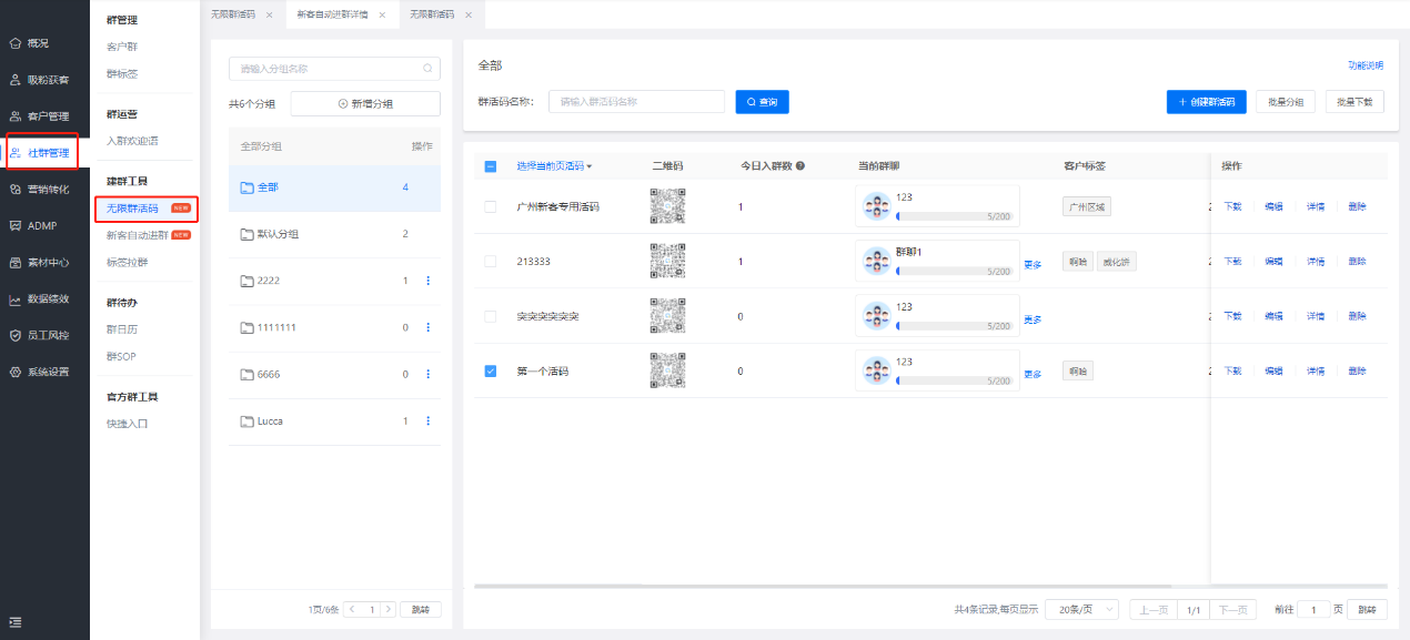 群活碼創建成功后,一共可以關聯企業微信五個群聊,一個群的人數達到200人后,活碼就會自動創建第二個群聊。也就是說客戶掃碼進群200人是上限,超過200人客戶就無法掃碼進入了,需要企業員工把客戶拉入群聊。