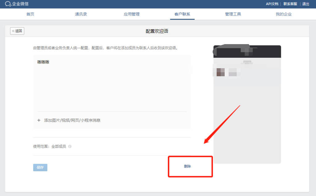 企業管理員可以在企業微信后臺的歡迎語頁面,進入已配置的歡迎語詳情頁面,選擇刪除或者重新編輯。