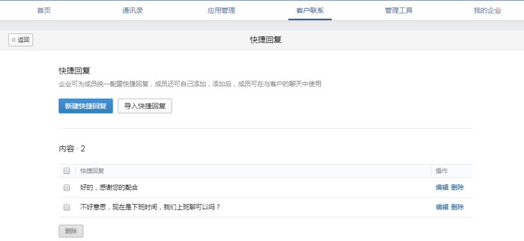 需要注意的是企業(yè)管理員在企業(yè)微信后臺(tái)設(shè)置的快捷回復(fù)和員工個(gè)人在前臺(tái)設(shè)置的快捷回復(fù),它們之間是混合在一起的。