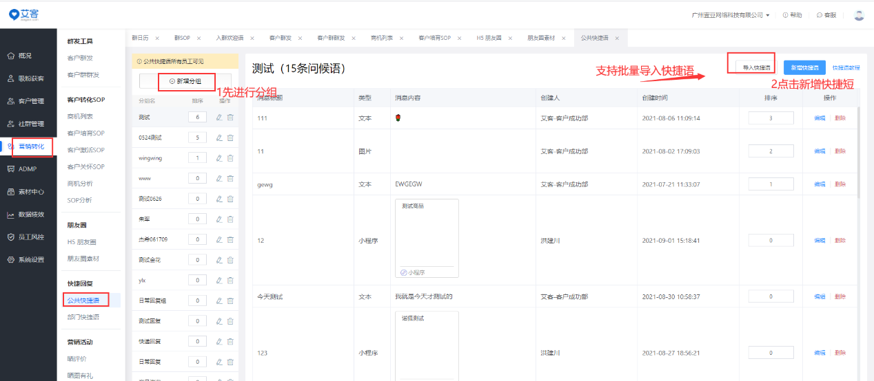企業(yè)可以使用艾客SCRM系統(tǒng)的公共快捷語(yǔ),它支持快捷語(yǔ)以文本、圖片、視頻、鏈接、文件的形式出現(xiàn),能讓企業(yè)所有的子賬號(hào)都可以使用。讓員工能快速回復(fù),提升溝通效率,保證信息標(biāo)準(zhǔn)化。