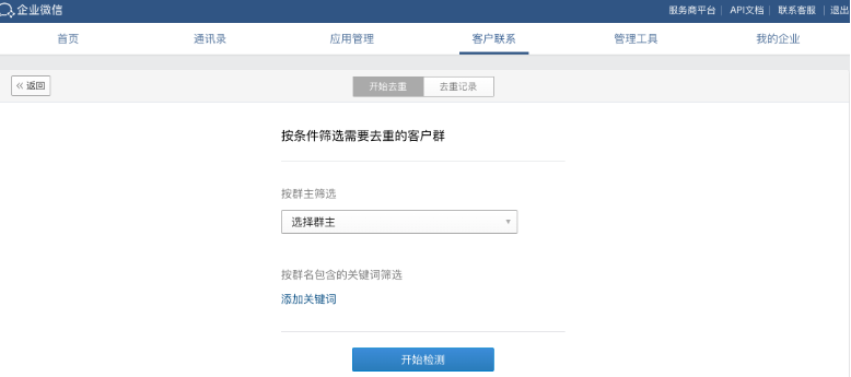 企業(yè)微信管理員登錄企業(yè)微信管理后臺(tái),在“客戶聯(lián)系”——“群成員去重”——“開始去重”——“選擇群主”——“開始檢測(cè)”,系統(tǒng)就會(huì)檢測(cè)出重復(fù)添加社群的客戶,并且做有效去重處理。同時(shí)在企業(yè)微信管理端,還可以查看去重記錄。