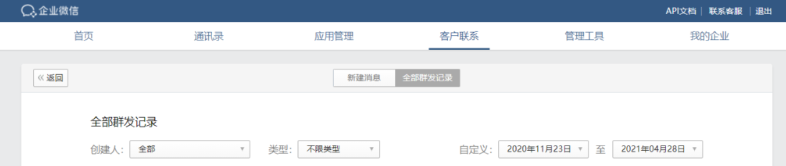 企業微信管理員下發了群發任務給企業成員進行群發后,還可以查看企業員工的群發消息情況,從“客戶聯系”——“配置”——“群發消息給客戶”/“群發消息到企業的客戶群”——“全部群發記錄”就可以查看員工是否群發了消息。并且可以按照時間進行篩選查詢群發記錄。