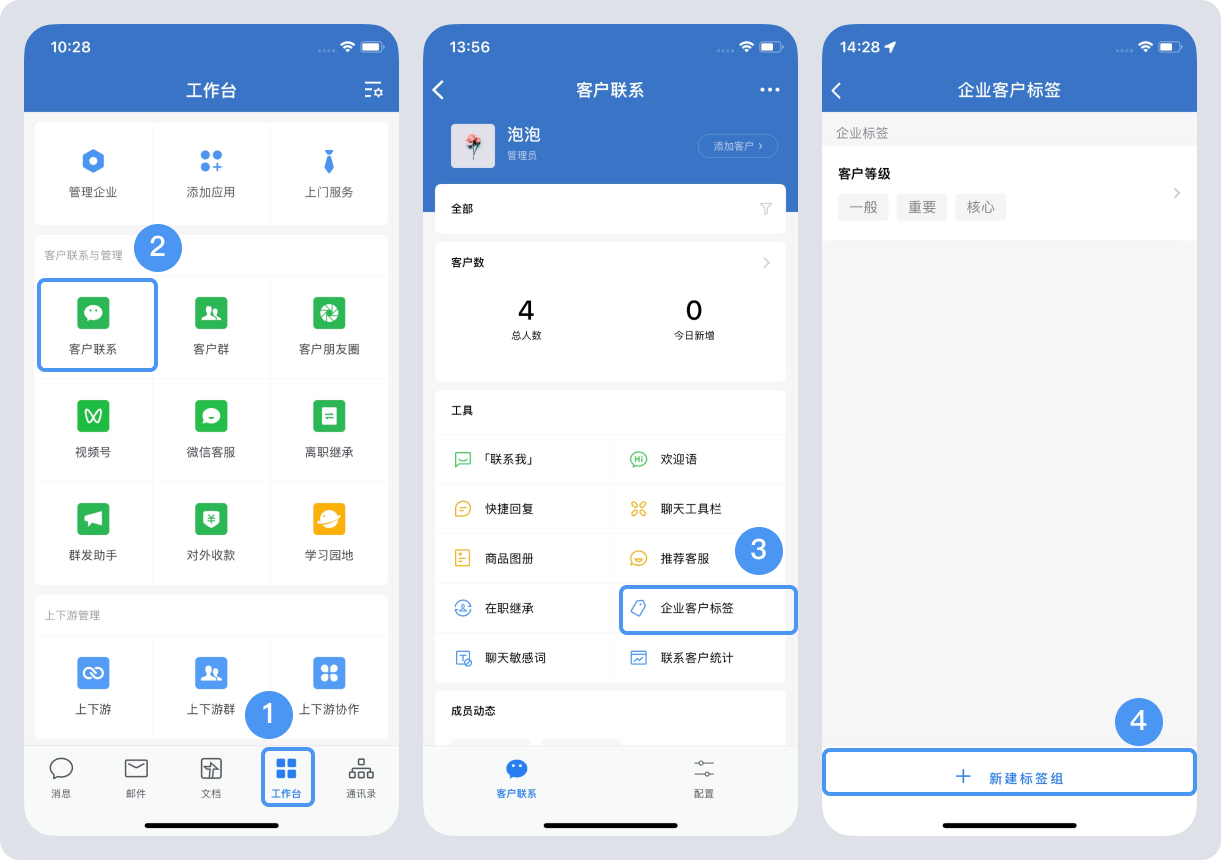同時也可以在手機端進行配置標簽組,登錄手機端企業微信,在“工作臺”——“客戶聯系”——“企業客戶標簽”——“新建標簽組”即可。