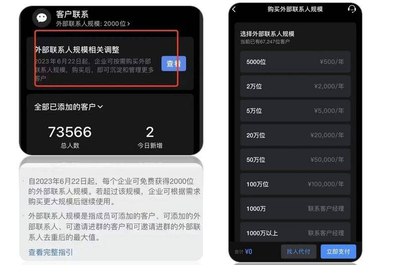 從部分企業收到的通知來看,外部聯系人免費加好友的規模是2000名,超過2000個之后會有收費的調整。比如5000個客戶一年需要繳納500元,以此類推,每個客戶一年0.1元的企業繳納費用。