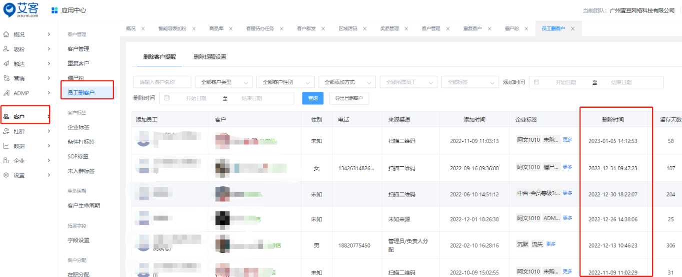 企業客戶資源流失一般主要有兩種情況:客戶主動刪除員工、員工刪除客戶。上面說的客戶刪除員工時艾客系統會主動給企業相關人員發送提醒,而當員工刪除客戶時,艾客助手同樣也會提醒對應管理人員。