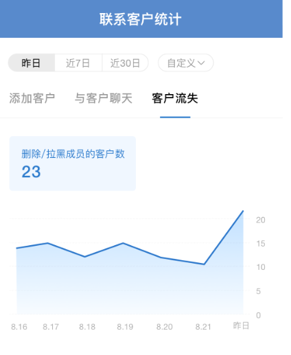 使用此功能可以從時間維度進行選擇,可以選擇昨日,也可以選擇近7日,近30日或者自定義時間查詢客戶流失數(shù)據(jù)。