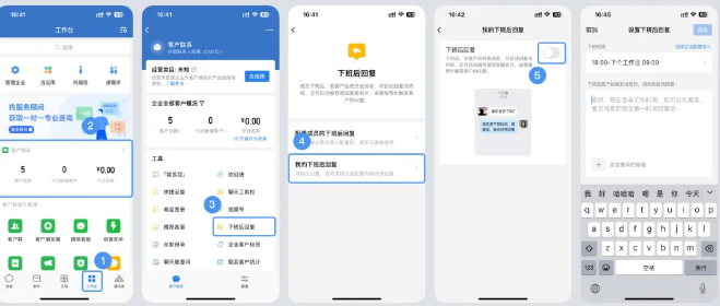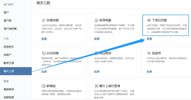 設置路徑:超級管理員登錄企業微信管理后臺,按【客戶與上下游】—【客戶聯系】—【聊天工具】—【下班后回復】進行配置,完成后就能直接使用,且全員統一。