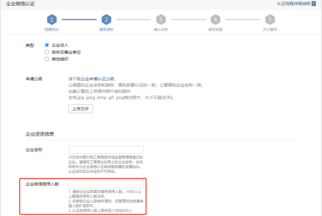 企業微信在進行認證是會有一項內容是“填寫資料”,會有一個人數選項,不要亂填寫這個數值哦,企業要根據自身發展情況填寫人數,因為認證通過后企業人數上限會擴容到填寫的人數數值。