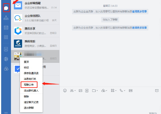 首先,登錄PC版企業(yè)微信主頁,點擊頁面上的“消息欄”按鈕,找到準(zhǔn)備發(fā)公告的企業(yè)群。然后點擊群頭像,找到【寫群公告】欄目。