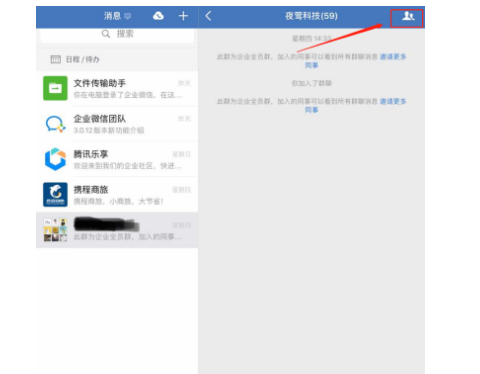 答案是可以的,我們先在消息欄中找到準(zhǔn)備群公告的目標(biāo)企業(yè)群,再點擊右上角的圖標(biāo)。