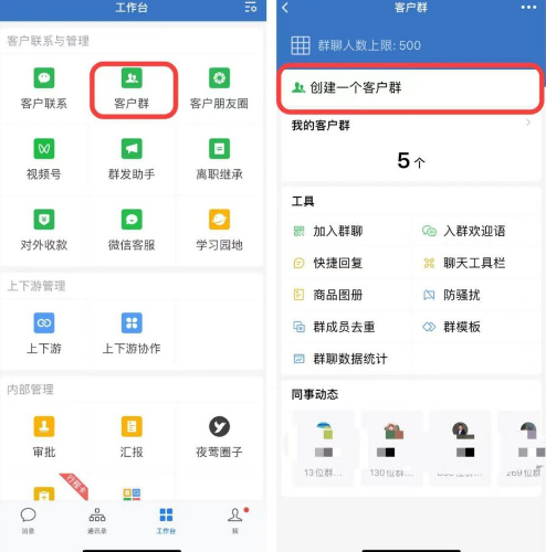 我們能進入【工作臺】—【客戶群】,點擊創建客戶群,創建的企微外部群,其中成員可是企業微信用戶,也能是微信用戶。