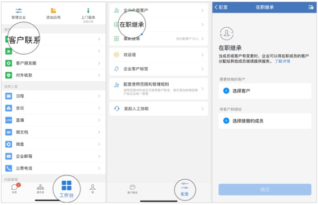 如果要使用企業(yè)微信在職繼承轉(zhuǎn)移,管理員可以在企微工作臺的【客戶聯(lián)系】—【配置】—【在職繼承】中將需轉(zhuǎn)接的客戶分配給其他成員。
